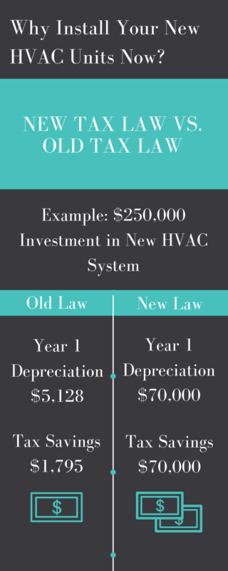So you know what that means… The time to replace HVAC equipment is NOW! If you’ve been putting off replacing your HVAC system, you might want to reconsider. New tax laws allowing for full depreciation in year one can mean huge tax savings, which can help offset a large chunk of your cost. Don’t miss your chance to take advantage, call now to get your new HVAC units installed before the end of 2018. Your accountant and your wallet will thank you.